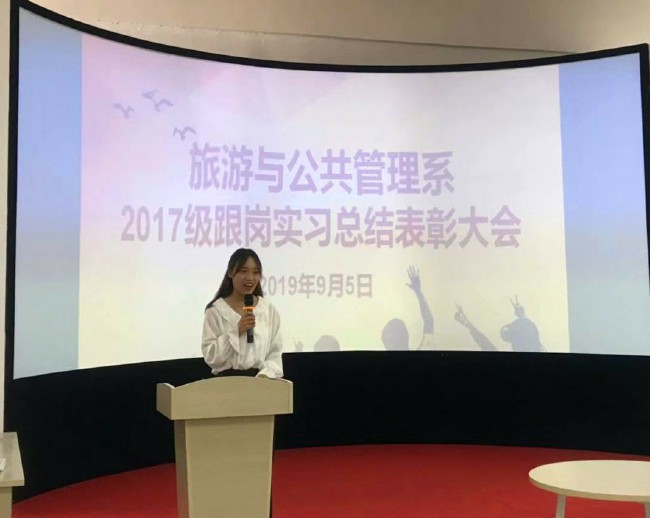 會上,2017級旅遊管理專業王層同學和2017級酒店管理專業韓小林同學分別代表實習生發言,與大家分享了實習心得。她們認為,跟崗實習是一次難能可貴的實踐經驗,通過這次實習,專業技能得到了提升,增強了專業信心,但同時也看到了差距,因此將更加珍惜接下來在校學習的時光,努力提升自己,為後續頂崗實習和就業做好準備。