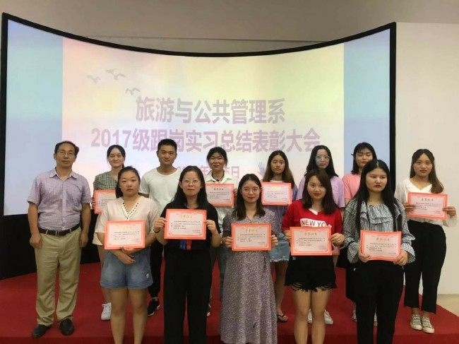 9月5日,旅遊與公共管理係在毓秀樓實訓室召開2017級旅遊類專業跟崗實習總結表彰大會。2017級旅遊類專業全體實習生和指導教師參加了會議。會議由係主任汪庭才主持。