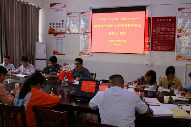 根據學校“不忘初心、牢記使命”主題教育工作安排,10月14日下午,校黨委副書記、校長沈波結合“不忘初心、牢記使命”主題教育的學習、調研體會和思考,聯係學前教育宏觀發展形勢和我校學前教育專業實際,在毓秀樓A(6)會議室作題為《提高政治站位,辦好學前專業》主題教育專題黨課報告。學前教育係全體黨員和非黨員教師代表聆聽了本次黨課。