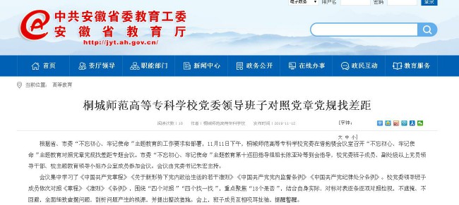 安徽教育網:《桐城師範高等專科學校黨委領導班子對照黨章黨規找差距》