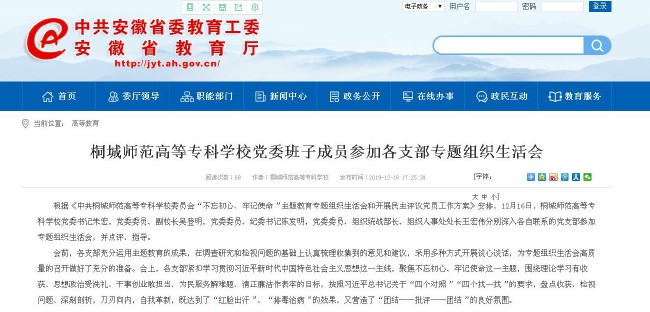 安徽教育網:《桐城師範高等專科學校黨委班子成員參加各支部專題組織生活會》