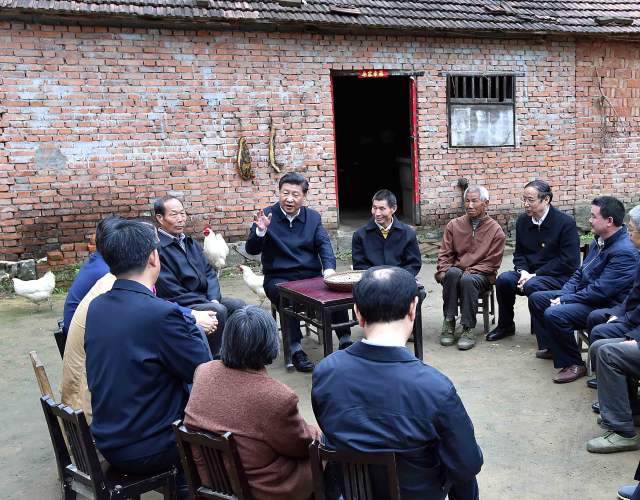 4月24日至27日,中共中央總書記、國家主席、中央軍委主席習近平在安徽調研。這是4月24日下午,習近平在六安市金寨縣花石鄉大灣村村民陳澤申家同村民們親切交流。新華社記者李濤攝