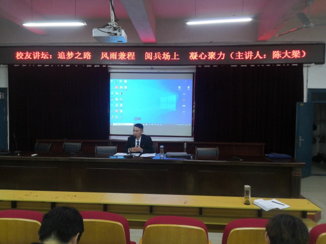 為宣傳學校育人效果,樹立學校良好形象,引發在校學生內在共鳴,使在校生得以自我發現與認可,激發學生成功欲和成就欲,形成積極向上的學習氛圍,由桐城師範高等專科學校學生處主辦,商貿與電子信息係承辦的校友講壇於3月8日下午14時30分在校以智樓報告廳開講,本次講座邀請到的是我校優秀畢業生陳大梁校友,主題為“追夢之路,風雨兼程,閱兵場上,凝心聚力”。講座由係分管學生工作副主任王煥庭主持,全校近200名男生聆聽了報告。
