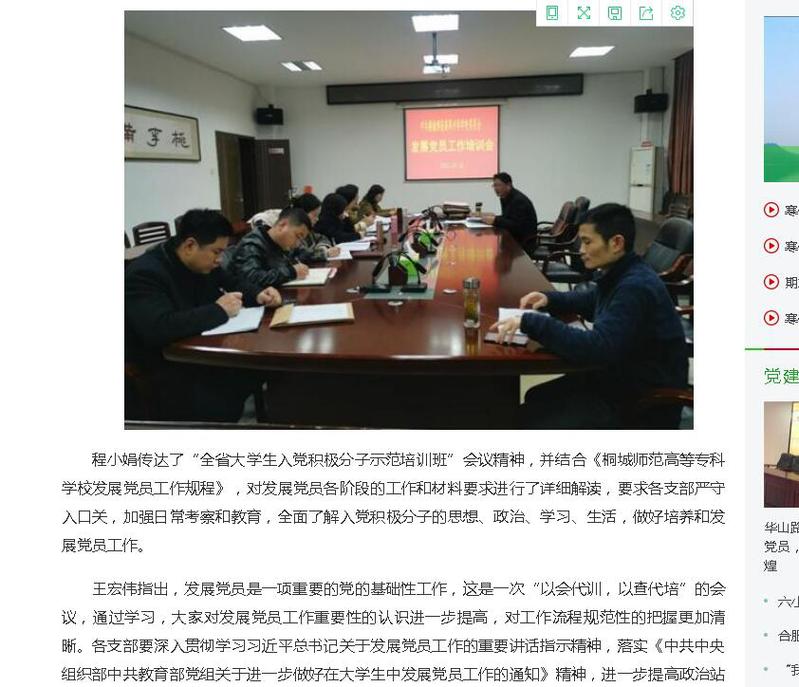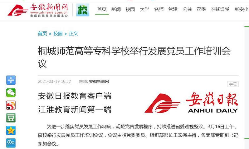 安徽新聞網:《桐城師範高等專科學校舉行發展黨員工作培訓會議》