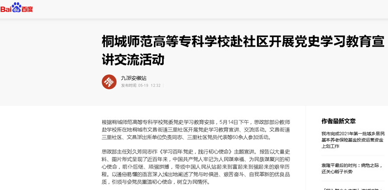百度:《桐城師範高等專科學校赴社區開展黨史學習教育宣講交流活動》