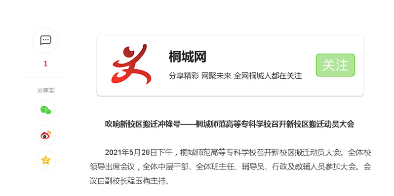 桐城網:《吹響新校區搬遷衝鋒號——桐城師範高等專科學校召開新校區搬遷動員大會》