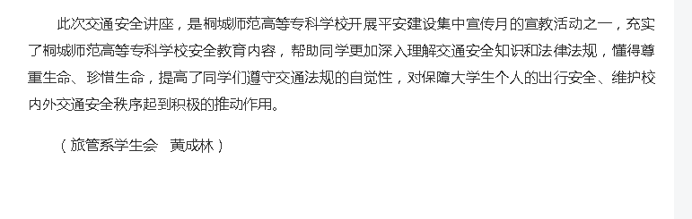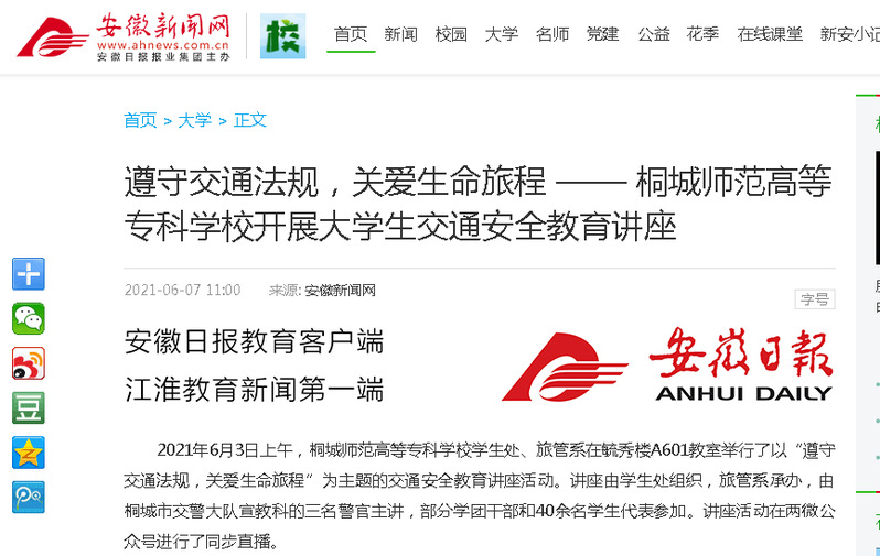 安徽新聞網:《遵守交通法規,關愛生命旅程——桐城師範高等專科學校開展大學生交通安全教育講座》