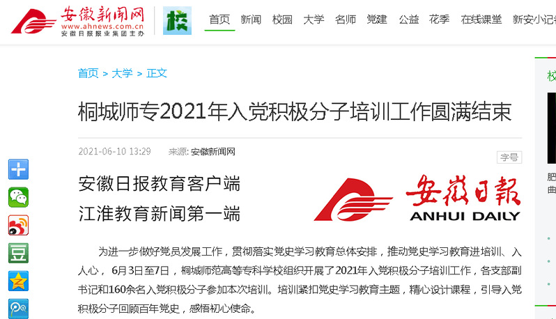 安徽新聞網:《桐城師專2021年入黨積極分子培訓工作圓滿結束》