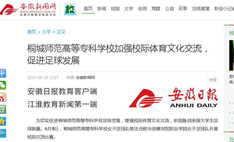 安徽新聞網:《桐城師範高等專科學校加強校際體育文化交流,促進足球發展》