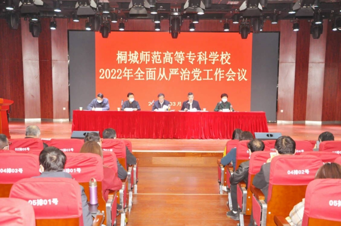 3月18日下午,桐城師專在音樂樓召開2022年全麵從嚴治黨工作會議,對過去一年全麵從嚴治黨工作進行總結,全麵動員部署2022年各項工作。校黨委書記王子龍出席會議並講話。黨委委員、副校長吳登明,黨委委員、紀委書記張敏麗,黨委委員、組織(統戰)部長王宏偉及學校副處級以上幹部、各單位主要負責同誌、各支部委員參加了會議。會議由黨委副書記、校長沈波主持。