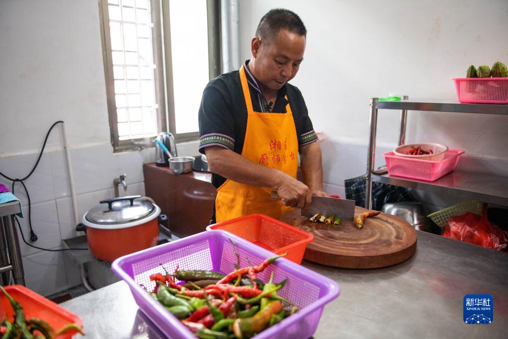 2020年9月17日,在汝城縣沙洲瑤族村,朱小紅在自家開的農家樂廚房裏切菜。新華社記者 陳思汗 攝
