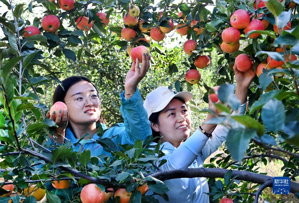 2021年9月10日,遊人在陝西省榆林市米脂縣高西溝村蘋果采摘園采摘蘋果。 新華社記者 陶明 攝