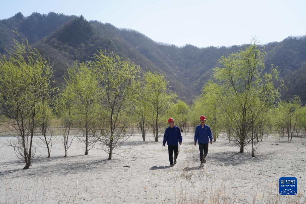 4月7日,金堆城鉬業集團有限公司工作人員在經過生態治理後的木子溝尾礦庫內巡查。 新華社記者 邵瑞 攝
