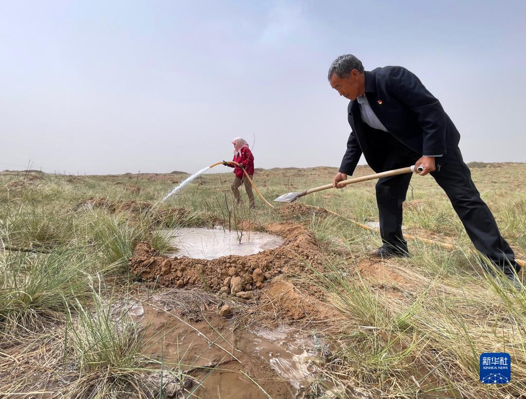 甘肅省武威市古浪縣八步沙林場場長郭萬剛(右)與林場職工為新種樹苗澆水(5月6日攝)。新華社記者 郭剛 攝