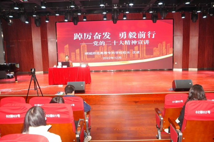 為了全麵學習宣傳貫徹黨的二十大精神,12月8日,校黨委副書記、校長沈波在校音樂廳麵向師生宣講黨的二十大精神。