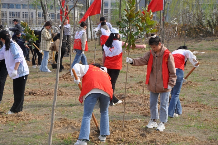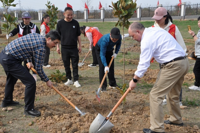 植樹現場,在校領導的帶領下,老師和同學們三五成組、揮鍬鏟土、踏土夯苗、提水澆灌,熟練認真地完成著每一道工序,不一會兒便為新校區靠北麵圍牆區域新添了不少“新丁”。大家將一棵棵滿載希望的樹苗種植下去,在和煦的春風中,樹苗錯落有致、亭亭玉立,為春日的校園增添了一抹新綠,盡顯盎然生機。