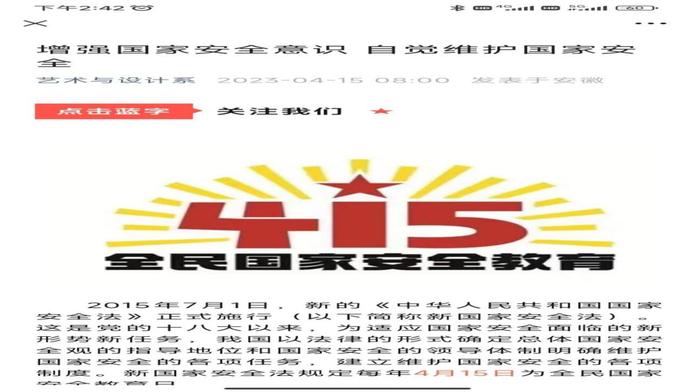 為響應第八個全民國家安全教育日,貫徹落實習近平總書記關於全麵加強國家安全教育的重要指示,深入學習貫徹總體國家安全觀,我校結合教育工作實際,以班會、觀看視頻、線上話題互動等多形式開展相關宣傳教育,引導師專學子自覺履行維護國家安全責任義務,增強法治觀念。