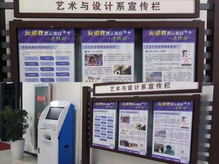 各係組織學生開展反邪教警示教育,觀看警示教育宣傳片,同時引導師生關注“中國反邪教”微信公眾號。藝術與設計係在教學樓布置了反邪教主題宣傳欄,一幅幅主題鮮明、內容豐富的宣傳資料和案例,吸引了師生們駐足閱覽。此次警示教育項目,使學生自覺抵製邪教侵蝕,營造了濃厚的反邪教校園氛圍,提高師生防範邪教的能力。
