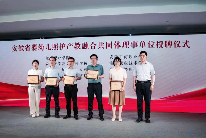 論壇發起成立安徽省嬰幼兒照護產教融合共同體,經過層層遴選和評估,我校被授予安徽省嬰幼兒照護產教融合共同體“常務理事單位”,共同體將為所有成員單位搭好平台、促進溝通、做好服務,發揮橋梁作用,共同體成員單位還將共享實習就業崗位資源,共建規範化建設標準,服務於安徽省嬰幼兒照護服務行業人才培養。