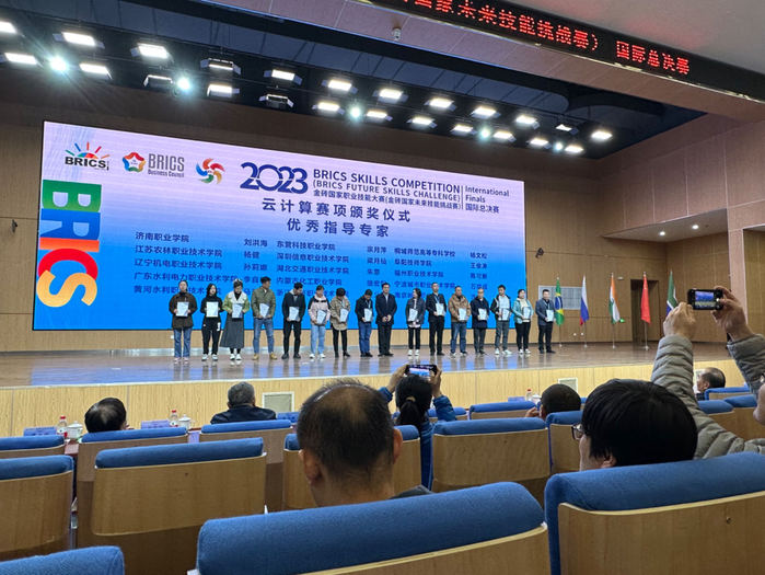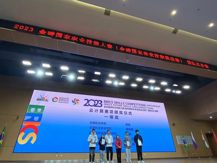 2023年11月7日,金磚國家職業技能大賽“雲計算”賽項國際總決賽在東營科技職業學院落下帷幕,本賽項共有來自中國、印度等國內外64支代表隊同台競技,我校22級大數據技術專業肖武同學以安徽省賽冠軍身份代表我省參加國際賽。經過層層選拔和激烈比拚,肖武同學脫穎而出、創造曆史,勇獲大賽一等獎,指導教師楊文鬆榮獲大賽“優秀指導專家”榮譽稱號。