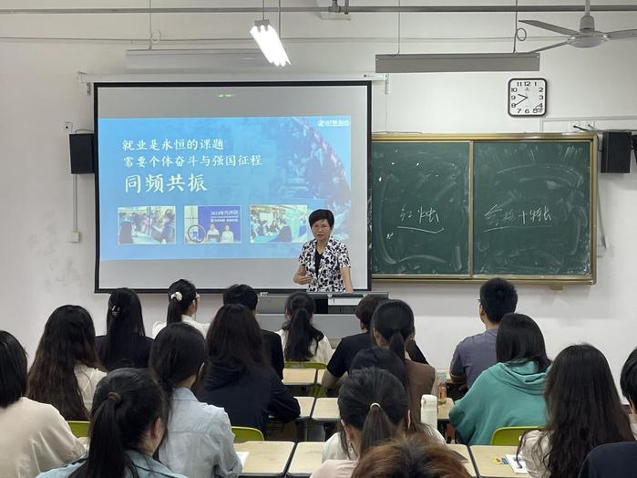 課上,張敏麗依托教育部統一課件,進行了授課展示,內容貼近現實、語言生動有趣。從小學老師的啟蒙開講,到暢談關於成為一名小學語文老師的人生理想,最後落實到學生實際。主要圍繞四個方麵展開:一是形勢總體穩定。經濟形勢的影響下就業形勢基本盤穩定,就業規模不斷擴大,就業結構持續優化,就業質量穩步提升,重點群體就業平穩;二是就業壓力仍存在。以走訪企業的親身經曆為例,深刻關注學生內心想法,指出就業總量壓力長期存在、結構性矛盾比較突出、重點群體就業麵臨難題及不確定不穩定因素增多等問題,指出要正視矛盾的兩麵性,正確麵對就業壓力;三是確保就業優先。從學生、家庭、學校多角度分析就業是最大的民生問題,強調要深入學習習近平總書記關於促進高質量充分就業、以人民為中心的發展思想,在習近平總書記的指示精神指導下,落實落細就業優先政策,全麵提升勞動者就業創業能力,並且就桐城師專90年代學校辦學特色展開講述,以“紅燭精神”激勵學生加強自身修養,錘煉師德師風;四是著力拓寬渠道。鼓勵支持高校畢業生到重點行業就業,著力穩定公共部門崗位規模,暢通成長路徑、讓畢業生在基層有發展,規範市場秩序、讓畢業生權益有保障。