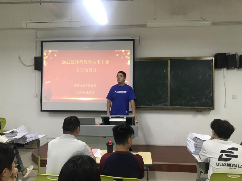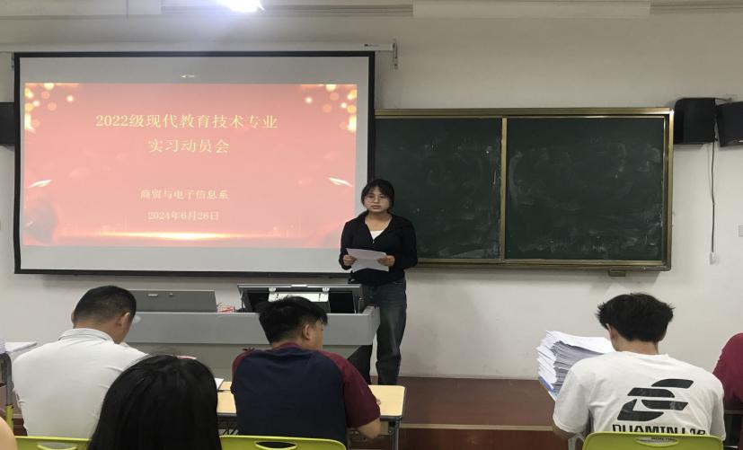 為進一步落實立德樹人根本任務,提高實習實踐育人質量,加強學生對實習的認知和了解,引導學生做好實習準備,確保實習工作的順利開展,6月26日,商貿與電子信息係在毓秀樓110教室召開了高專22級現代教育技術專業實習動員大會。
