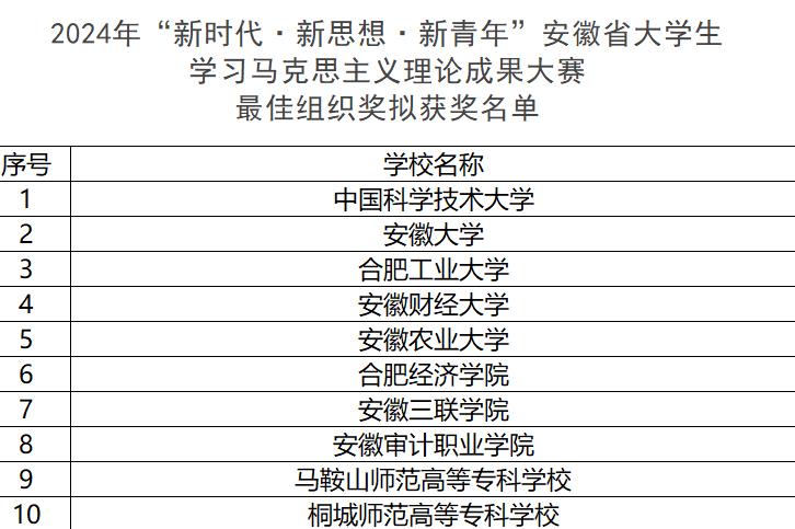 收悉2024年“新時代·新思想·新青年”安徽省大學生學習馬克思主義理論成果大賽獲獎名單揭曉,桐城師專報送的三項作品均獲獎,其中二等獎2項、三等獎1項,學校喜提最佳組織獎。