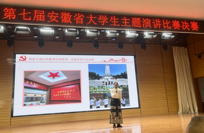 “八月桂花遍地開,鮮紅的旗幟豎呀豎起來”,比賽場上,湯曉是同學以一首大別山民歌開頭,激情昂揚地講述著我校暑期大學生社會實踐團隊奔赴革命老區金寨,拜訪非遺傳承人、唱響非遺民歌、開展紅色宣講、傳承紅色精神等係列社會實踐活動。