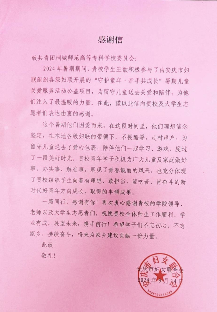 來信特地感謝我校學前教育係王歆同學在“守護童年,牽手共成長”暑期兒童關愛服務公益項目中的傑出表現。王歆同學利用暑期時間,在當地婦聯的帶領下,不畏酷暑,走村串戶,為當地的留守兒童送去愛心與關懷,陪孩子們一起學習、遊戲,度過了一個快樂充實的假期。