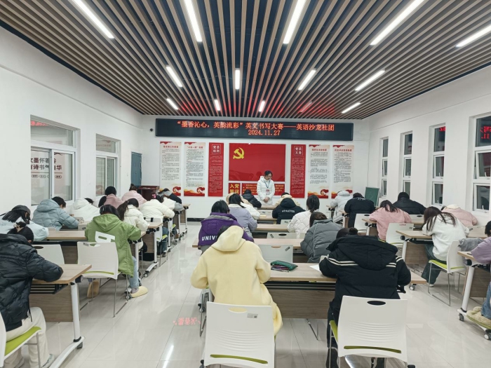 11月27日晚,英語沙龍社團在11號樓一站式學生社區成功舉辦了主題為“墨香沁心,英韻流彩”的英文書寫大賽,參賽選手在規定時間(45分鍾)內現場臨摹一篇指定的英語美文,共有37名英語愛好者參加,現場氛圍良好、秩序井然。