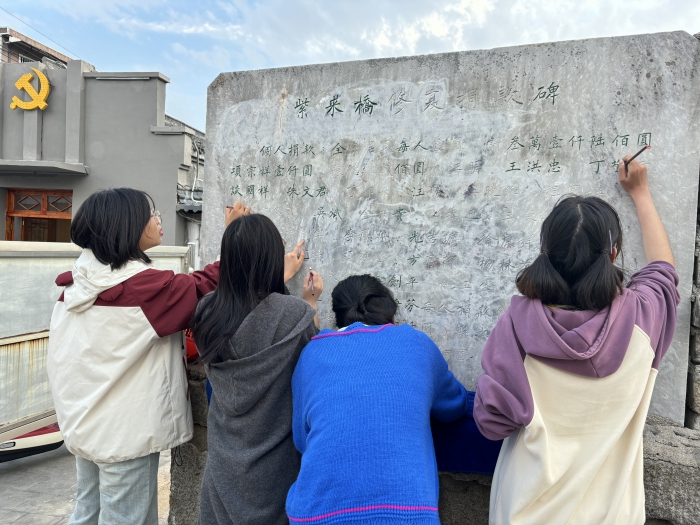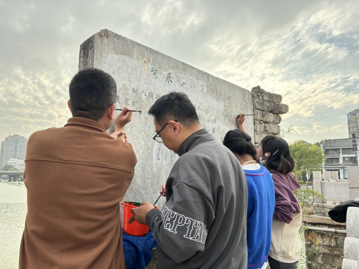 活動伊始,龍眠街道東關社區黨總支書記朱倩倩向在場的同學們,詳細介紹了這座古橋的文化淵源以及其獨特精巧的橋體結構。隨後同學們在社團指導老師胡中軍的帶領下,認真細致地為橋碑和修繕捐贈碑刻進行漆描,一筆一劃都飽含著對傳統文化的尊重與傳承。大家齊心協力,用自己的雙手為保護曆史遺跡貢獻出一份力量。
