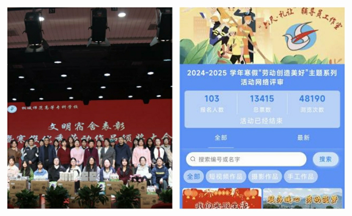 2025年乙巳蛇年春節是“春節——中國人慶祝傳統新年的社會實踐”被列入聯合國教科文組織人類非物質文化遺產代表作名錄後的首個春節。桐城師範高等專科學校“六尺·禮讓”輔導員工作室以此為契機,策劃開展了一場“勞動創造美好”為主題的、融合勞動教育和傳統文化的創新實踐活動。活動通過四個子項目分項開展,累計收到勞動實踐短視頻、勞動攝影照片、實習勞動感悟、創意手工作品等四類作品257項,經過初審,103項作品進入到網絡投票和評委評審環節。最終所有作品網投總票數為13415,瀏覽量超4.8萬人次,在校園內掀起勞動實踐和傳統文化傳承交流的熱潮。說明:f71bf6e4f0f6a46a39560ad4a79a71c 說明:0c67ad950ae1fc847ecf718079e5d77