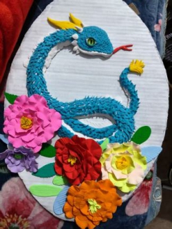 “創意手工”(實物)製作大賽中,參賽學生們巧妙運用紙張、毛線、廢布等環保材料,將傳統文化元素與自己的奇思妙相結合,通過創作實現作品與心靈的對話,為普通物品注入了獨特的文化意義。24學前2班陳雅雪的獲獎作品《蛇年行大運》,以蛇和牡丹為主題,牡丹寓意富貴吉祥,蛇呼應乙巳蛇年的生肖文化,象征新生蛻變,傳遞突破自我、向上成長的精神力量。 說明:cdbe0db520daff97fdb1d2f0bc2ad2d1_說明:e40b72480eeb799239bb336b0edf3e26_說明:8d43ccc2f5115799fd591b889ca23641_