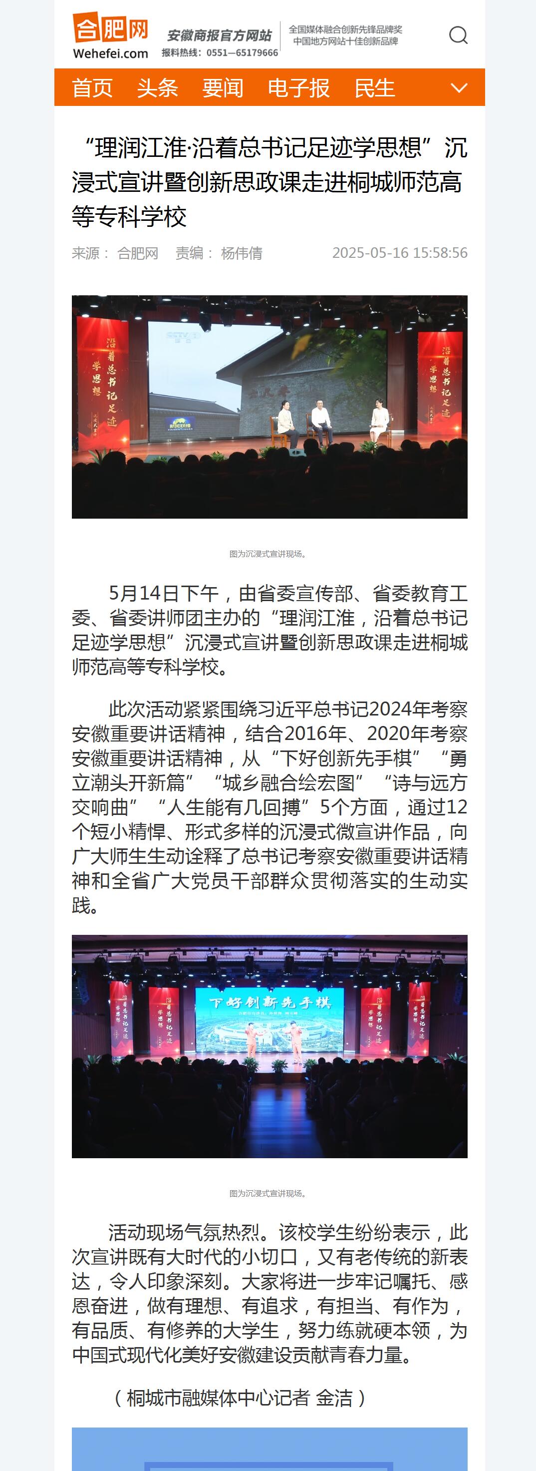合肥網:“理潤江淮·沿著總書記足跡學思想”沉浸式宣講暨創新思政課走進桐城師範高等專科學校