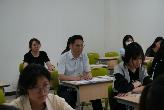 聽課過程中,江貴生認真記錄教師的教學內容、教學方法、課堂互動等情況,細心觀察學生的課堂表現、學習狀態和參與度。課後,江貴生與授課教師展開了深入交流,充分肯定了教師們在教學過程中的亮點,如較紮實的教學基本功、穩健的教風台風、豐富的案例引入等,同時也結合教學實際,就教學方法的創新運用、師生互動的有效開展等方麵提出了針對性的建議和意見。