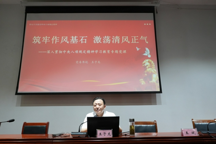 校黨委書記王子龍以“築牢作風基石,激蕩清風正氣”為主題授課,學校全體黨員參加此次專題黨課。
