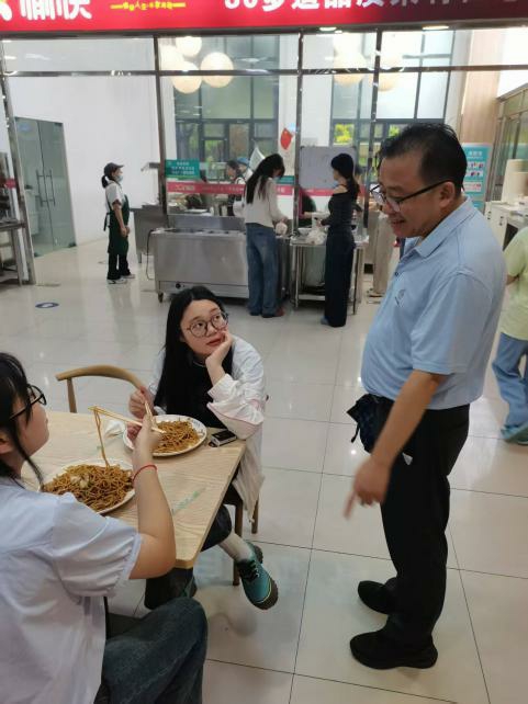 在就餐區,王子龍書記等領導與正在用餐的新生和老生親切交流,關切地詢問大家對食堂飯菜的口味、價格是否滿意,是否有飲食方麵的建議或需求。同學們紛紛主動向領導們反饋情況,現場互動氛圍融洽。領導們認真傾聽每一位同學的心聲,叮囑食堂工作人員要充分尊重師生意見,持續優化菜品質量,豐富菜品種類,合理調控價格,努力為師生提供安全、營養、便捷的餐飲服務。