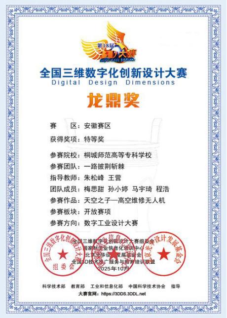 近日,“2025第18屆全國三維數字化創新設計大賽”省賽評選結果正式揭曉。我校24級大數據1班同學梅思甜、孫小婷、馬宇琦和24級汝綸(文)班同學程浩組成團隊,在朱鬆峰老師的指導下,憑借紮實的專業功底和出色的創新思維脫穎而出,斬獲安徽賽區數字工業設計方向特等獎,順利晉級全國決賽。