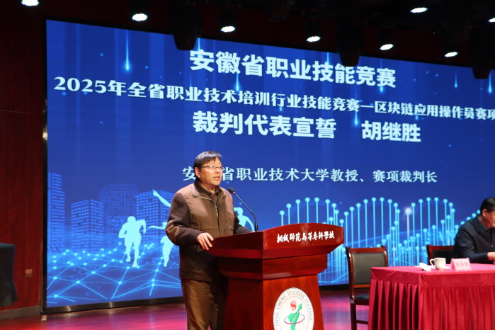 開幕式上,安徽省技能人才管理服務中心副主任張維明宣布比賽正式開始。安徽省職業技術培訓協會執行秘書長孫濤在致辭中表示,本次競賽聚焦區塊鏈應用操作核心技能,旨在以賽為媒,深化職業技能培訓改革,助力行業技能標準落地實施。我校黨委委員、副校長王宏偉代表承辦方致歡迎辭,對各位領導、裁判及參賽選手的到來表示熱烈歡迎,詳細介紹了學校在計算機、區塊鏈等相關專業領域的建設成IMG_7757果,並承諾將全力做好賽事保障工作,確保競賽公平公正、順利開展。隨後,裁判代表與學生組選手分別莊嚴宣誓,恪守競賽規則,踐行職業精神。