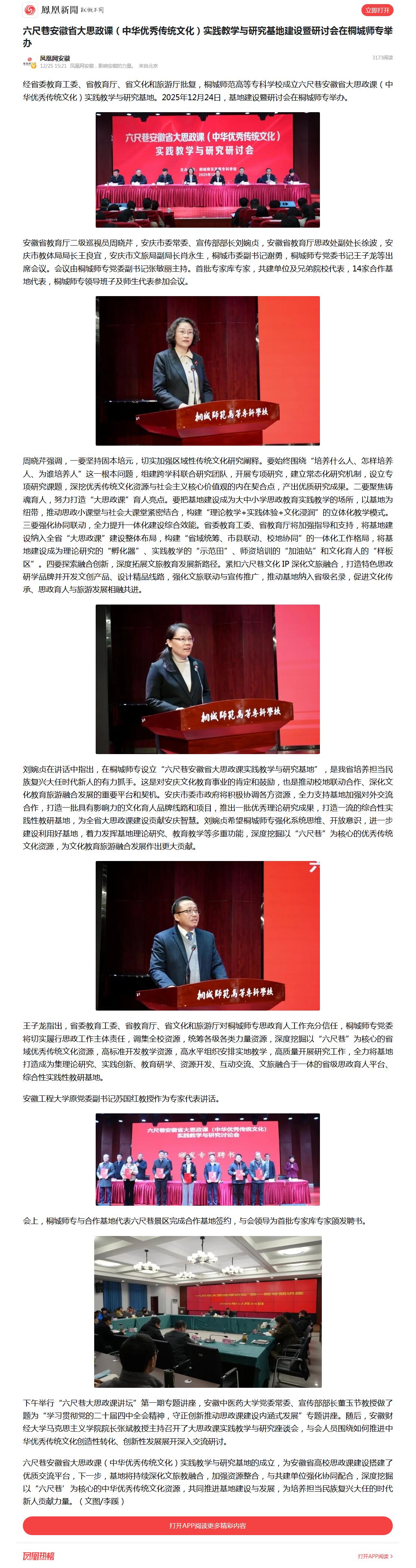 鳳凰新聞:六尺巷安徽省大思政課(中華優秀傳統文化)實踐教學與研究基地建設暨研討會在桐城師專舉辦