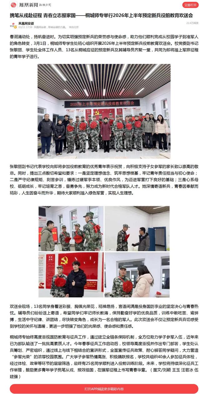 鳳凰新聞:攜筆從戎赴征程 青春立誌報家國——桐城師專舉行2026年上半年預定新兵役前教育歡送會