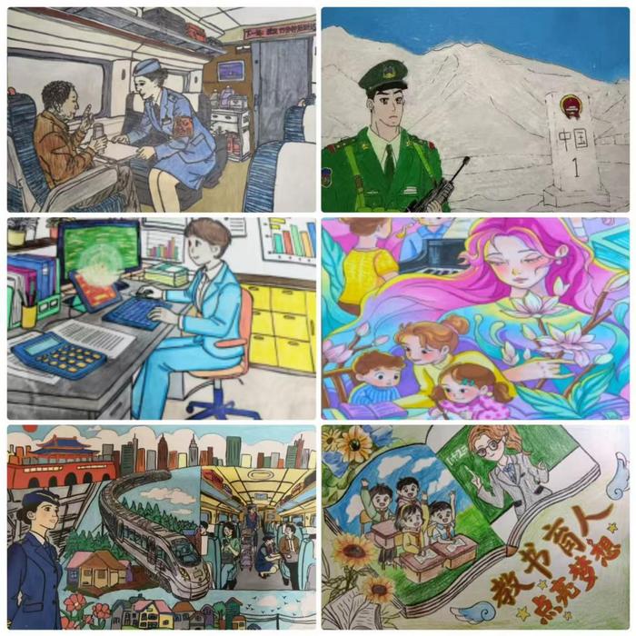 從三尺講台的人民教師、守護旅途的高鐵乘務員,到嚴謹務實的財務工作者、衛國戍邊的中國人民解放軍……一幅幅作品主題鮮明、情感真摯,既清晰呈現了同學們對不同職業價值的深刻理解,也精準表達了對職業技能與核心素養的認知追求。同學們將青春理想與時代發展同頻共振,把個人追求融入國家與社會需要,以藝術之筆點燃奮鬥熱情,讓職業夢想清晰可觸,充分彰顯了新時代青年學子的責任擔當與遠大誌向。說明:045892411d5bd51109024b90ec7c43af