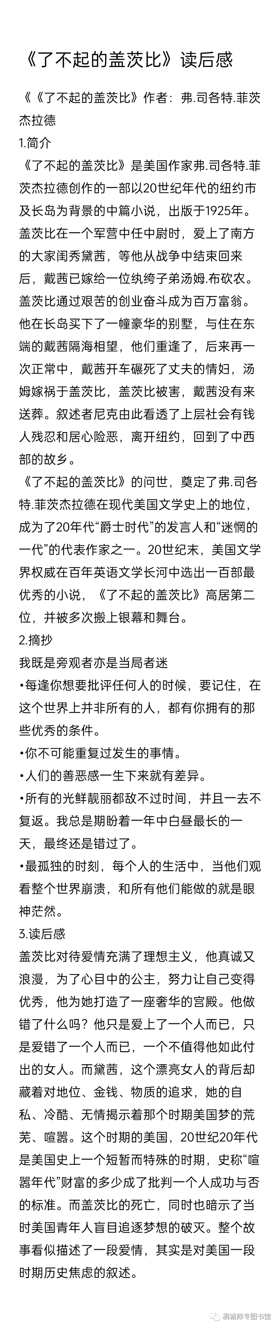 李夢婷:最近剛讀了《了不起的蓋茨比》,有做摘抄,還寫了讀後感。