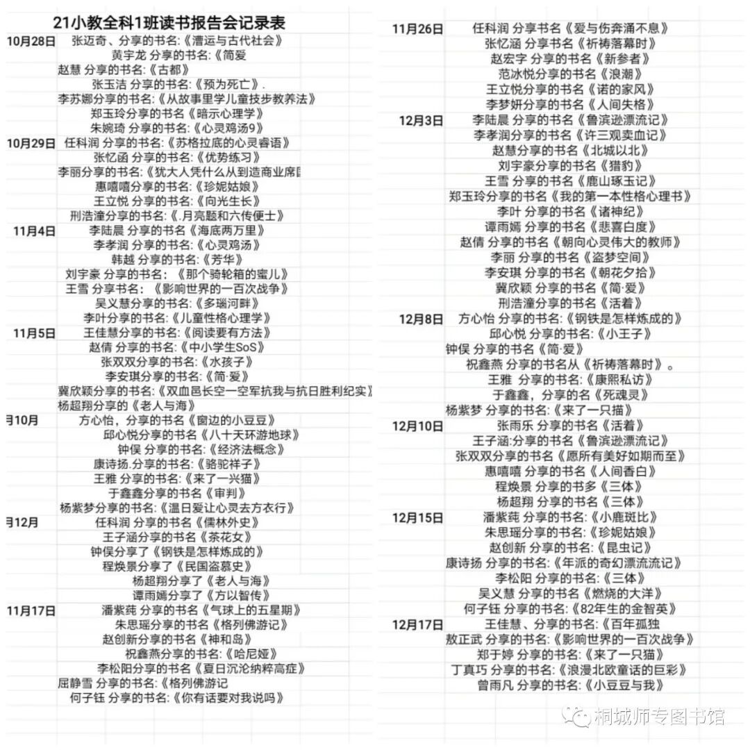 小教21全科1班:自去年9月份入學以來,輔導員就一直要求关键词2每周開一次讀書分享會,現在已成為关键词2班每周常規性“第二課堂”活動。在活動的帶動下,关键词2班同學堅持每周去圖書館借閱書籍,撰寫讀書報告,參與班級“閱讀之星”評選,並在班級讀書分享會上分享心得體會、交流思想。7個月以來,全班同學在這種氛圍的影響下,愛上了閱讀、學會了表達、學會了傾聽、學會了交流、學會了分享,更多的是各方麵能力都得到了提升。