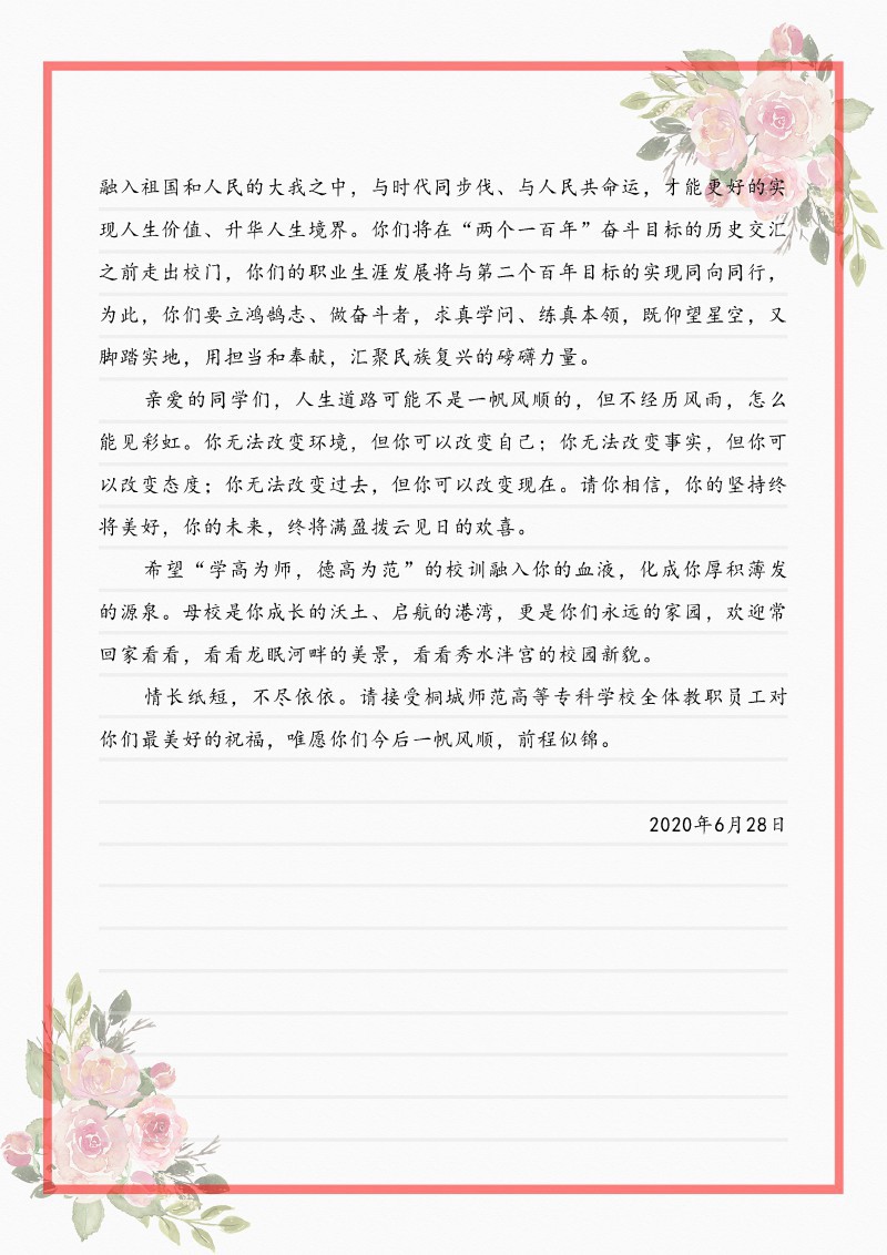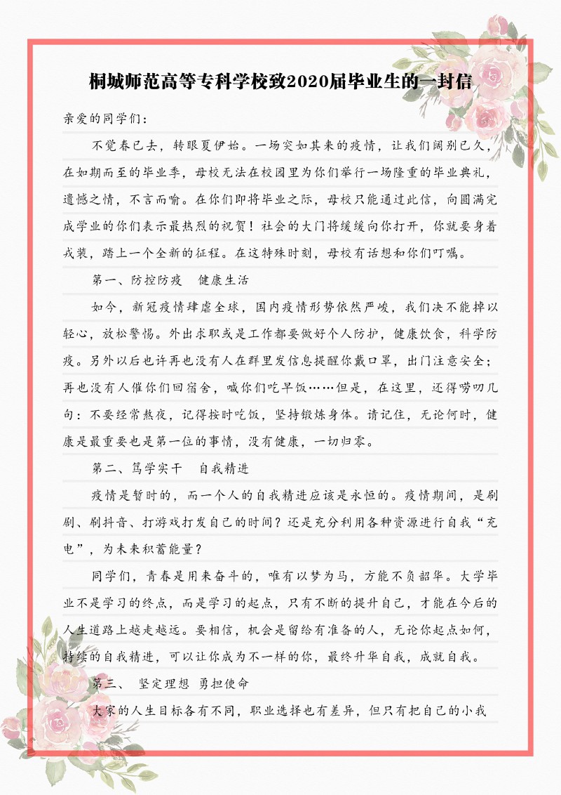 桐城師範高等專科學校致2020 屆畢業生的一封信
