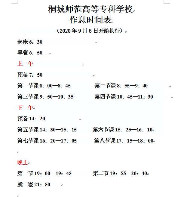 桐城師範高等專科學校作息時間表