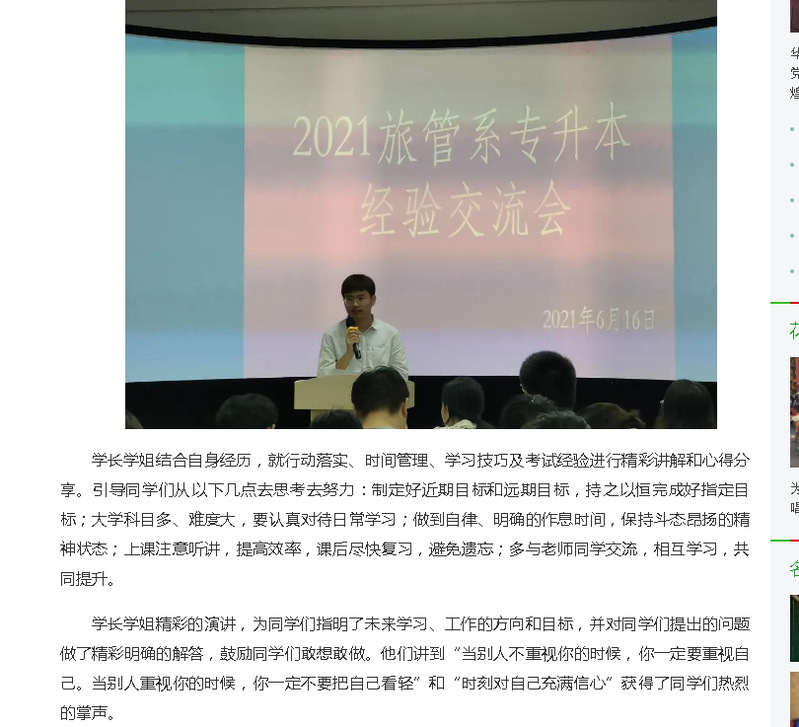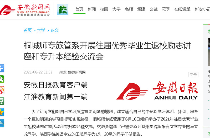 安徽新聞網:《桐城師專旅管係開展往屆優秀畢業生返校勵誌講座和專升本經驗交流會》