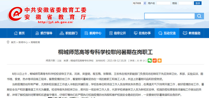 安徽教育網:《桐城師範高等專科學校慰問暑期在崗職工》