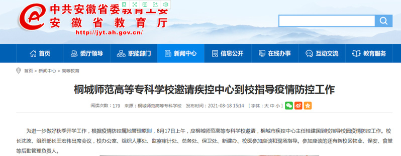 安徽教育網:《桐城師範高等專科學校邀請疾控中心到校指導疫情防控工作》