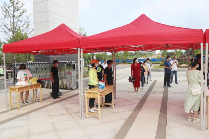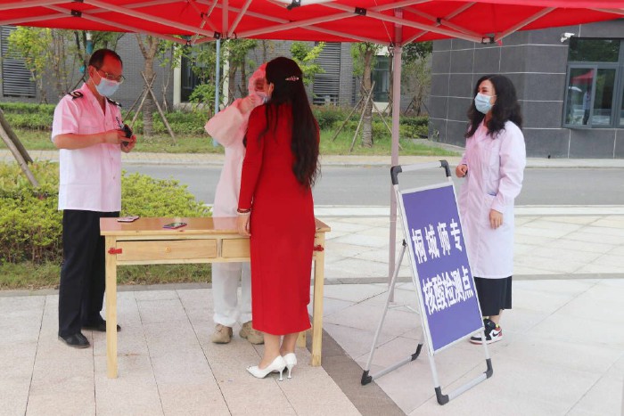 在學校大門,進行了學生返校報到流程相關場景演練。教師、輔導員扮演學生、工作人員等角色,逐項演練了學生返校報到中的排隊引導、身份核驗、消毒測溫、核酸檢測等工作流程。在食堂,進行了學生排隊取餐、進餐等場景模擬。在教室,進行學生上課時突發情況處置演練,在學生公寓,進行了學生晚檢就寢時發熱相關場景演練。演練過程人員分工明確、措施落實到位。